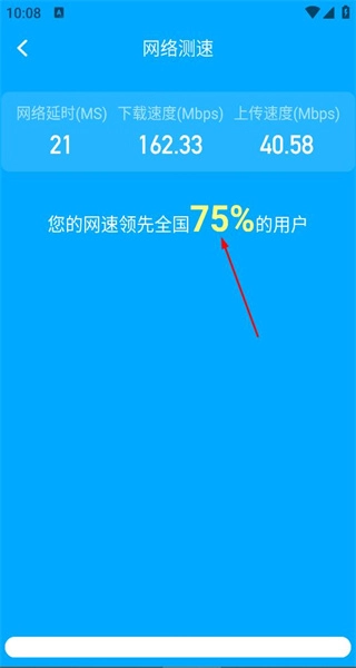 4、查看测速完成后的结果,了解网络延时上传速度,确认网速领先全国的占比。