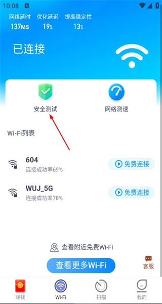 1、打开软件后,进入WiFi页面,查看已连网络,点击安全测试选项进入检测页面。