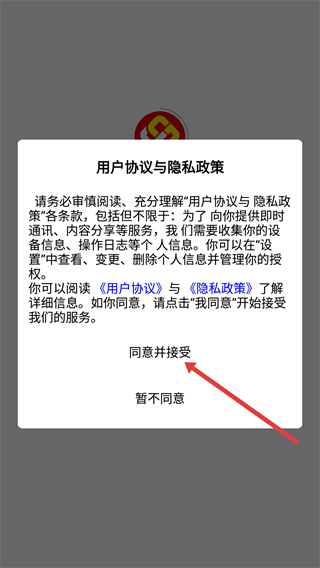 1、进入应用后会弹出【用户协议与隐私政策】提示,阅读【用户协议】-【隐私政策】后点【同意并接受】可使用服务。