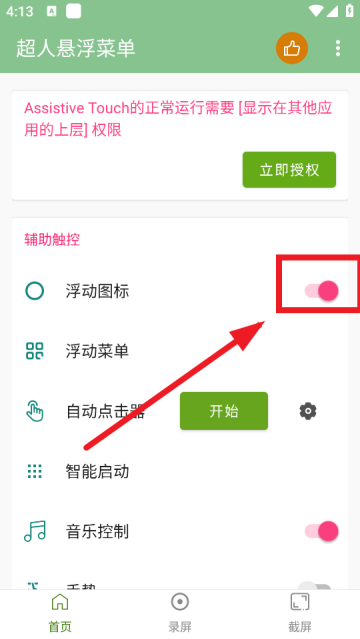 1、打开超人悬浮菜单软件,点一下首页的开启按钮