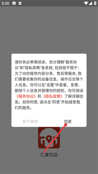 1、启动【汇廉优品】后弹出提示,需阅读【服务协议】与【隐私政策】,点击【同意】使用服务。