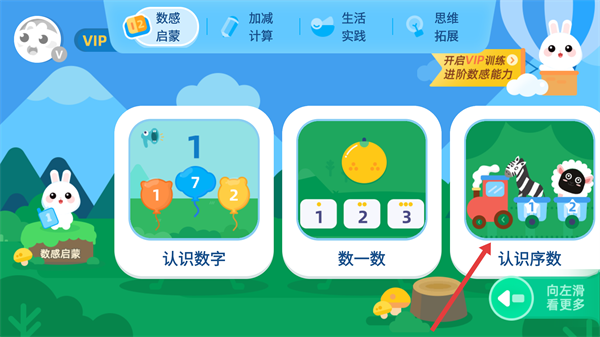1、进入【数感启蒙】界面后,点击【认识序数】模块,通过卡通场景来开启序数学习,还能左滑浏览更多相关内容。