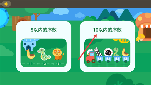 2、进入序数认知分类页面,选择【10以内的序数】这一选项,借助卡通形象所对应的序号场景,来理解并掌握10以内的序数概念。
