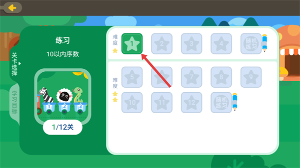 3、进入10以内序数的练习界面,选择【难度1】关卡,开启相应练习,按照进度完成12关的序数学习任务。