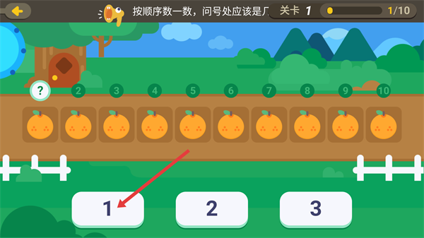 4、关卡1的练习里,按照“按顺序数一数”的提示,挑选对应的数字选项(比如问号的位置选“1”),完成每关10道题的序数练习。