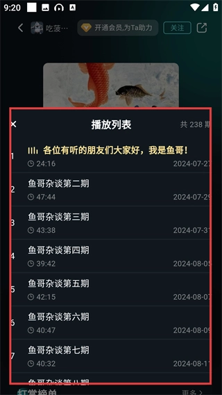 2、进入内容详情页后,能看到该内容的全系列列表,选择想要听的期数,就能开始播放对应的音频啦。