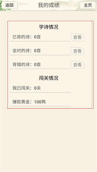 3、在【我的成绩】页面,可查看【学诗情况】(已背、全对、背错的诗数量)及【闯关情况】(闯关数、获取黄金数)。