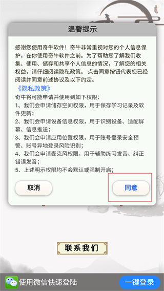 1、阅读【温馨提示】的权限说明后,点击【同意】按钮,确认协议以进入软件功能选择界面。