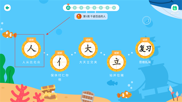 2、在单元课程页,选择目标汉字模块(如含“人”字的试听模块),进入该汉字的学习环节。
