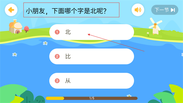4、在选择题环节,根据题目要求(如“哪个字是北”),点击正确选项(如“北”)完成作答。