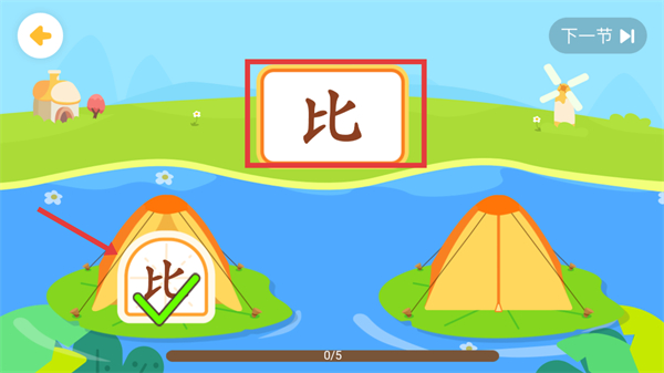 3、在汉字学习界面,根据上方显示的汉字(如“比”),选择对应匹配的选项完成练习。