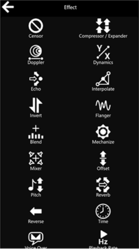 可以调节低音或高音的Equalizer功能。即便在调节音量水平时,也能使用Auto Gain功能。Voice Over功能可实现背景音乐的淡出效果。Censor功能能够用哔哔声或其他声音进行替代。还可以添加回声、混响、法兰等音效。