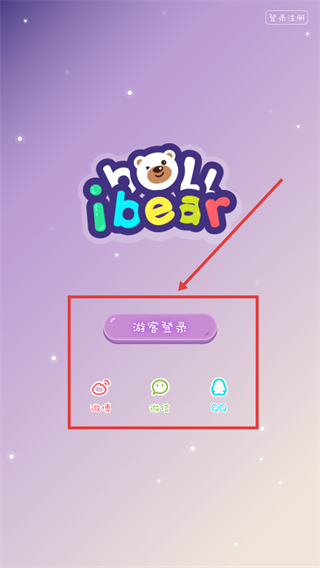 1、在登录选择界面,可通过【游客登录】快速进入应用,也可选择【微博】【微信】【QQ】等第三方账号登录。