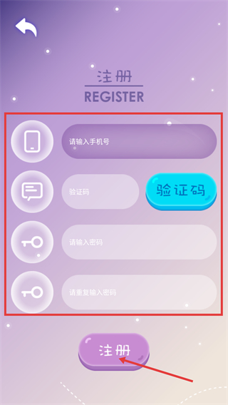 3、在注册界面,依次填写【请输入手机号】、获取并填写【验证码】、设置【请输入密码】及重复密码,点击【注册】完成账号创建。