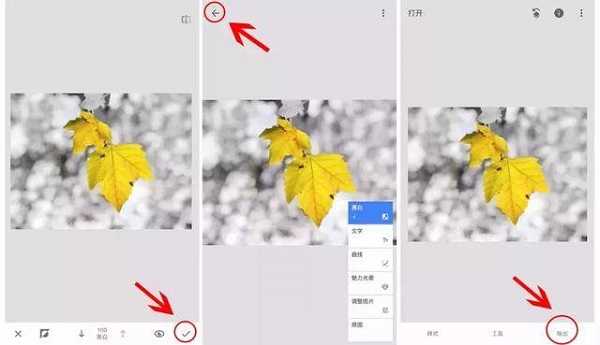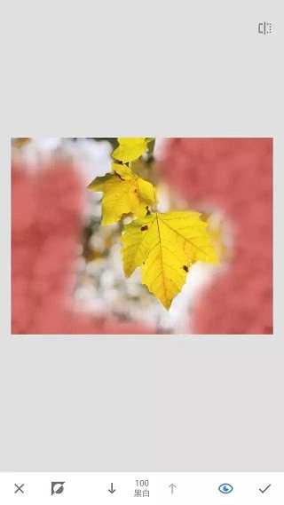 第四步,涂抹完成后,就可以点击右下角“√”,再点击左上角箭头,回到主页面,背景就变为黑白,树叶保留原来的黄色,直接导出照片即可,这就完成了一张蒙版单一色彩的处理。
