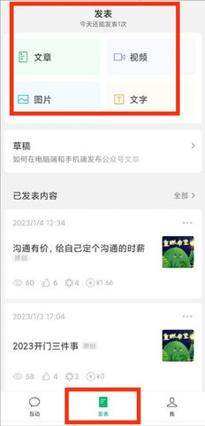 2、登陆成功后,在首页的最底端:点击【发表】,在【发表】页面中,点击文章。