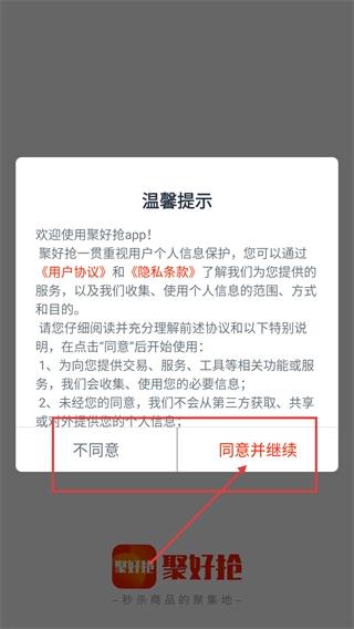 1、打开【聚好抢】后,需阅读【《用户协议》】和【《隐私条款》】,点击【同意并继续】按钮。