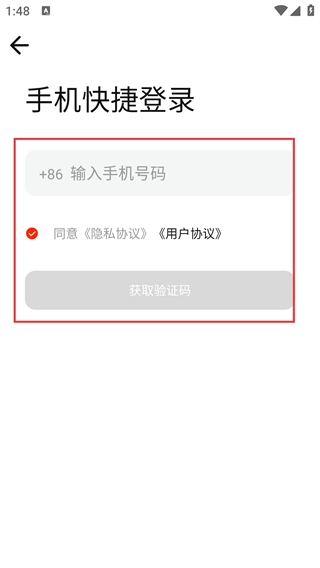 2、进入【手机快捷登录】页,在【+86-输入手机号码】框填号码,再点击【获取验证码】。