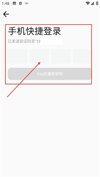 3、验证码发送后,在【手机快捷登录】的输入框填收到的验证码,注意【55s后重新获取】的倒计时。