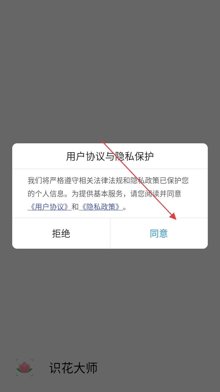1、第一次打开识花大师应用时,点击【同意】按钮以确认接受用户协议和隐私保护政策,随后即可进入主界面。