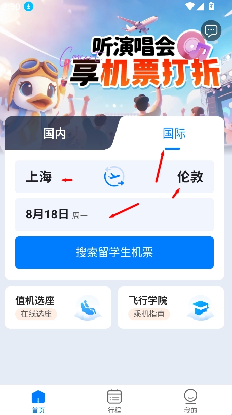 进入早鸟学生机票首页后,在搜索栏填写出发地“上海”与目的地“伦敦”,选定出行日期并点击搜索,就能快速查询到相关航班及学生票的信息。