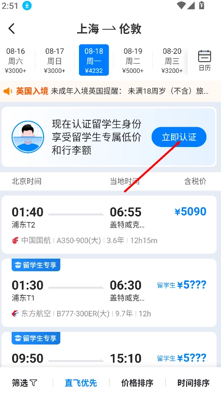 学生完成身份认证后,就能挑选心仪的航班直接预订,享受优惠的票价和便捷的购票流程。