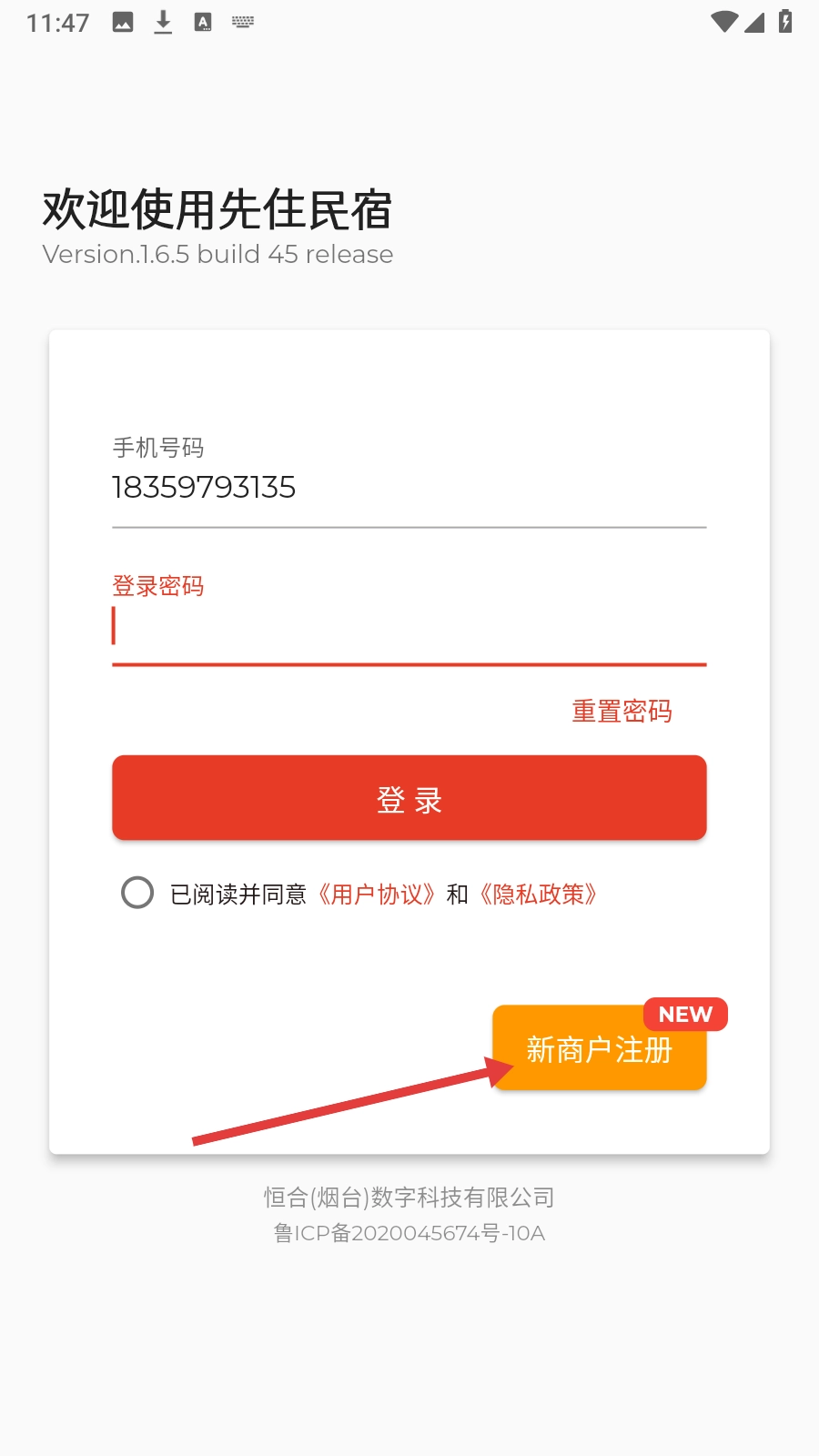 1、在登录页面找到并点击【新商户注册】按钮,即可进入新商户注册页面。
