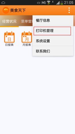 点击右上角出现的下拉菜单,就能找到打印机管理选项,菜单中还包含餐厅信息、系统设置和联系方式等内容。