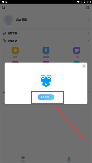 2、在弹出的登录选项弹窗,点击【手机登录】按钮,进入手机号验证的登录界面。