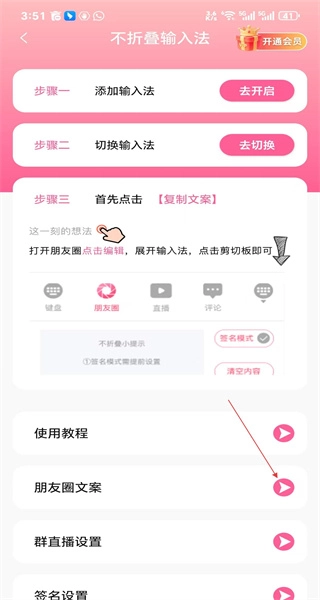 1、打开软件后,进入不折叠输入法页,浏览功能选项,点击朋友圈文案选项进入对应页面。