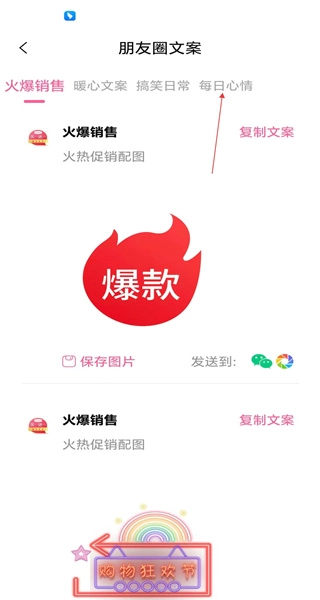 2、进入朋友圈文案页面,查看分类标签,点击每日心情标签切换至对应文案列表。