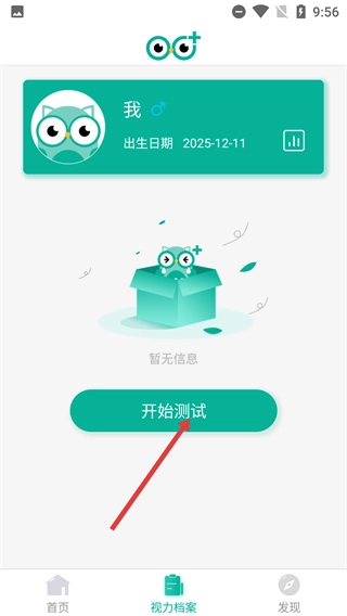 2、在视力档案页面,查看个人信息后,点击【开始测试】按钮,启动视力检测的流程。
