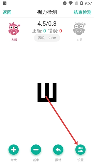 3、在视力检测页面,可查看当前检测数据,点击底部的【设置】按钮,打开检测参数的调整界面。