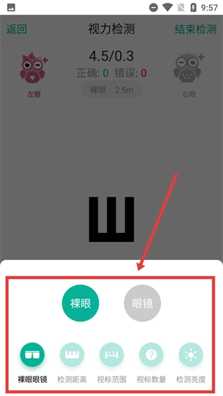 4、在设置界面中,可选择【裸眼】或【眼镜】检测模式,还能调整【检测距离】【视标范围】等参数。