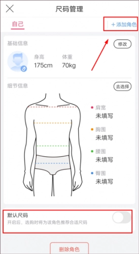 2、您可以在“添加尺码角色”中添加您的新角色,以便管理您的尺码信息,您需设置一个默认的尺寸;
