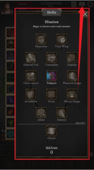 6、点击【书本】的图标,如图所示,可以查看自己的技能点。