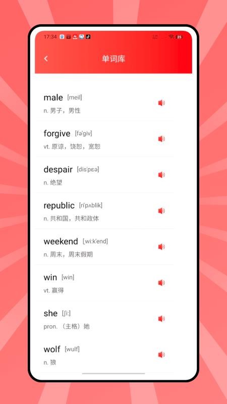 2、点击“开始背单词”,进入单词学习界面,查看单词的拼写、发音、释义及例句。