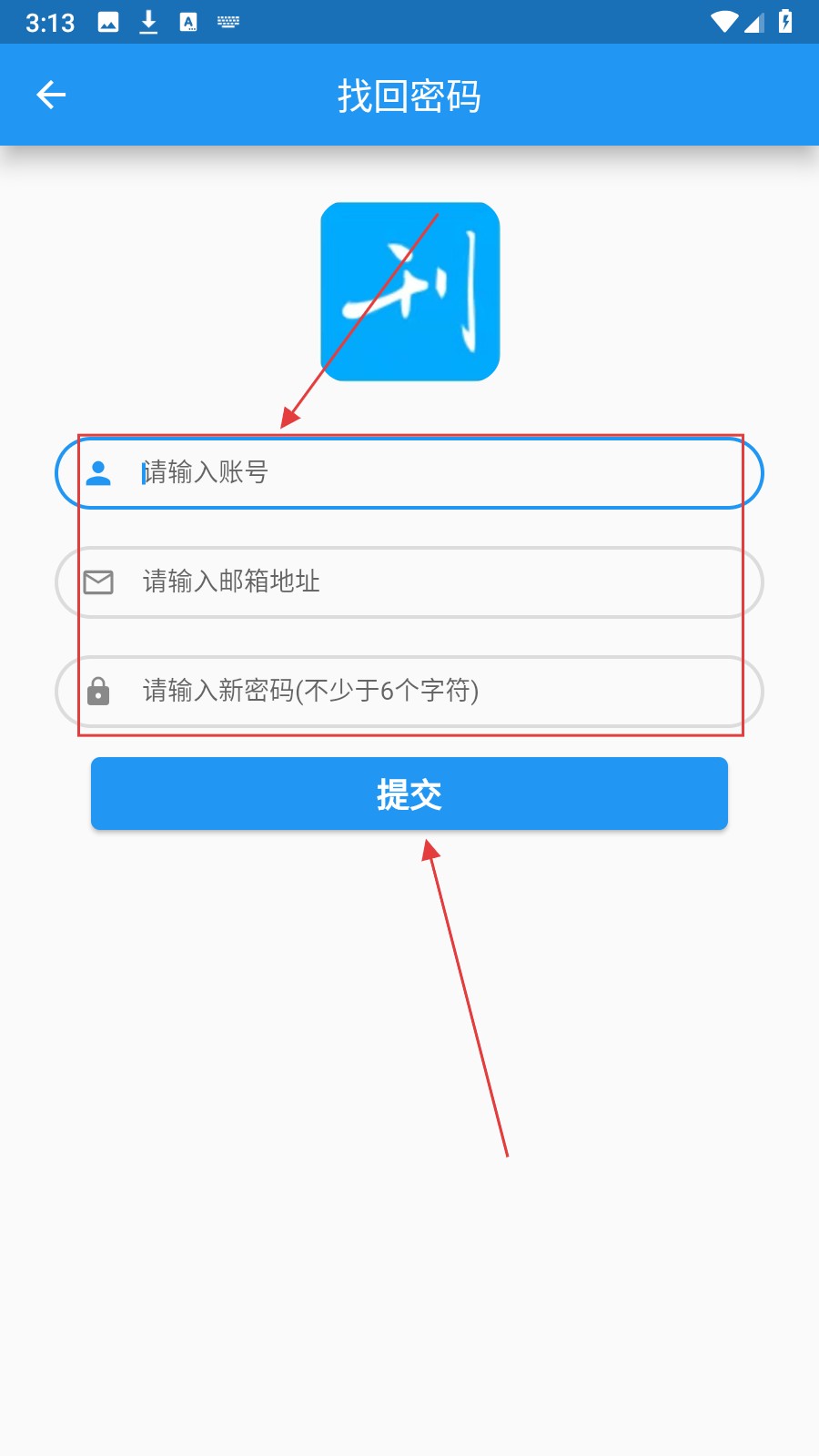 4、输入账号、邮箱地址和新密码,点击提交按钮,就能完成密码找回操作。