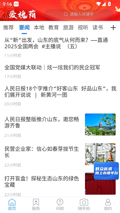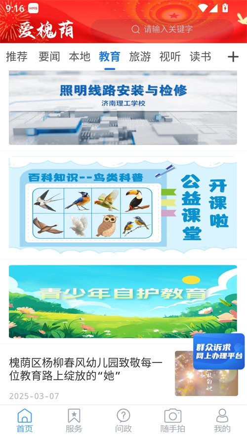 爱槐荫是专门为槐荫区居民开发的新闻服务应用,在这里,你能及时获取国家及槐荫本地的热点资讯,轻松知晓近期发生的重要事件。平台涵盖教育、旅游、新闻、视听、读书等丰富板块,你还可以依据个人兴趣输入关键词进行搜索,系统会为你推送最新的相关信息。软件界面简洁直观,操作便捷流畅,感兴趣的话就快来体验吧!