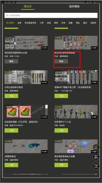 在模组库里,玩家能挑选自己想体验的内容,这里提供了丰富多样的模组选项,像人物、动漫、游戏、生物、武器、物品、载具、合集包、战争、超级英雄、建筑等类别都有涵盖;玩家还可以自行上传模组,与其他网友分享。