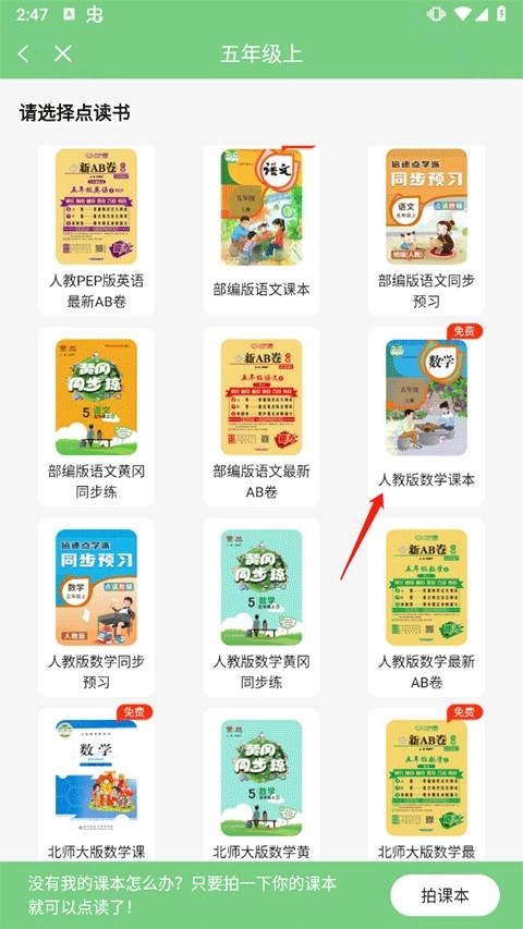 1、打开爱点读,在选书功能中,找到在学的数学书课本并添加至首页中
