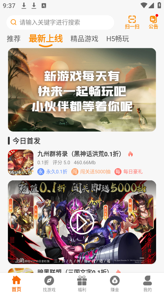 首页为玩家提供了海量热门游戏,涵盖最新上线、精品游戏以及H5畅玩游戏。