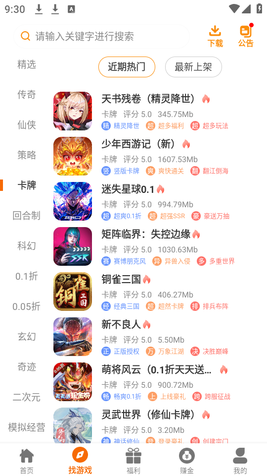 “找游戏”板块对游戏进行了细致分类,涵盖卡牌、仙侠、策略等多种类型。