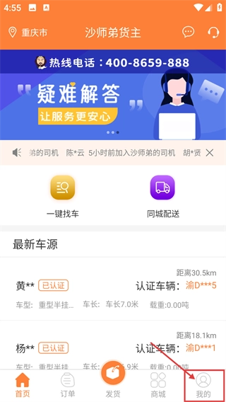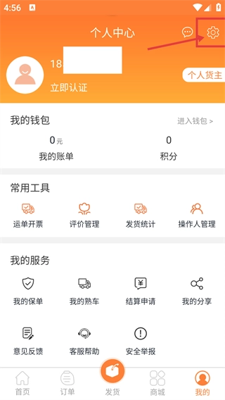 1、打开沙师弟货主的首页后,点击页面底部的【我的】选项,就能进入个人中心页面,这个页面包含了钱包、常用工具等各类功能的入口。