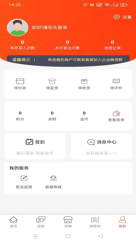2、进入【我的】页面后,右上角有【设置】入口,页面含待付款-待发货等订单功能,还有签到-消息中心等服务。