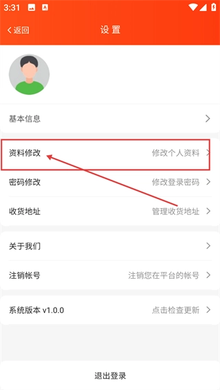 3、进入【设置】页面后,可找到【资料修改】选项,该选项用于调整个人信息,还能进行密码修改-地址管理等操作。