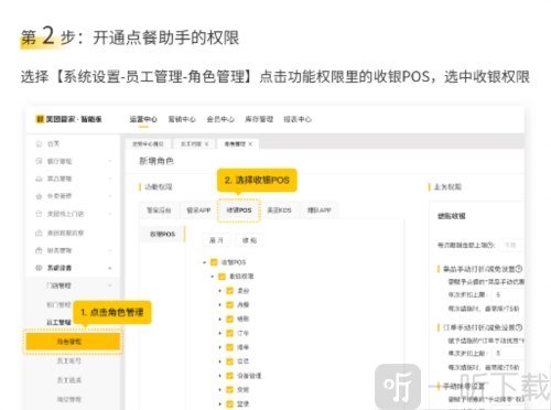 选择【系统设置-员工管理-角色管理】,点击功能权限中的收银POS选项,勾选收银权限