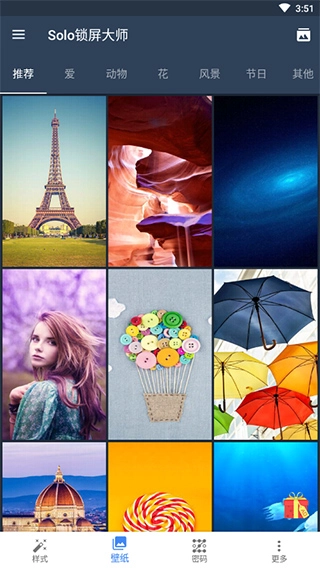 Solo锁屏大师是一款专业的手机锁屏软件,也常被叫做DIY锁屏大师或solo locker。它为用户提供了动态唯美的个性场景与锁屏主题、多样有趣的独特解锁方式,还有快捷便利的应用入口,能让用户打造专属的手机锁屏。在制作过程中,用户可以灵活运用照片锁屏、九图锁屏、九宫格锁屏、自定义锁屏、滑动锁屏、数字锁屏、小工具、壁纸以及辅助软体等功能来辅助创作,这样能让锁屏效果更出色。