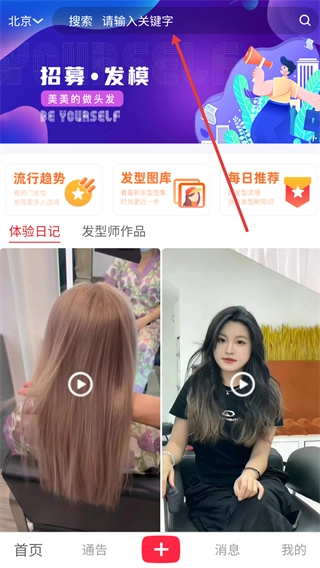 1、在美发类应用首页,点击顶部【搜索】栏,可进入搜索界面并输入关键词查找相关内容。