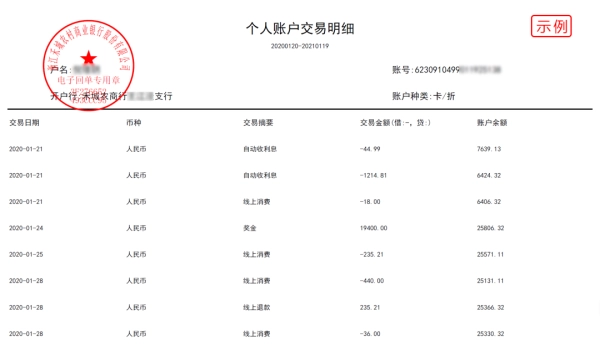 ❸电子版个人账户交易明细带红色电子印章;